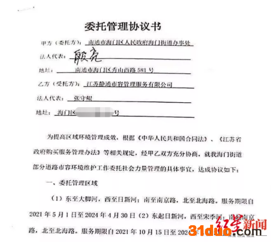据红星新闻,记者查询到,今年4月,南通市海门区人民政府海门街道办事处与江苏静通市容公司签署了《委托管理协议书》,委托书显示,服务期限自2021年5月1日至2024年4月30日止,合同试用期至2021年7月30日,合同经考核合格后逐年签订,委托承包管理费用总金额为2437万余元。