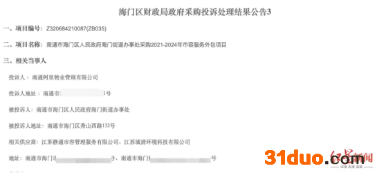 江苏政府购买服务信息平台显示,2021年6月11日,海门区财政局发布《海门区财政局政府采购投诉处理结果公告3》,内容为南通阿里物业管理有限公司投诉海门区海门街道办和相关供应商江苏静通市容公司及另一家公司。