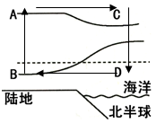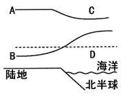 (2)读图,根据海拔升高,气压降低的原理,在近地面同一高度上,海洋的气压高,D在等压面B下面,所以D点气压高,即海洋气压高。