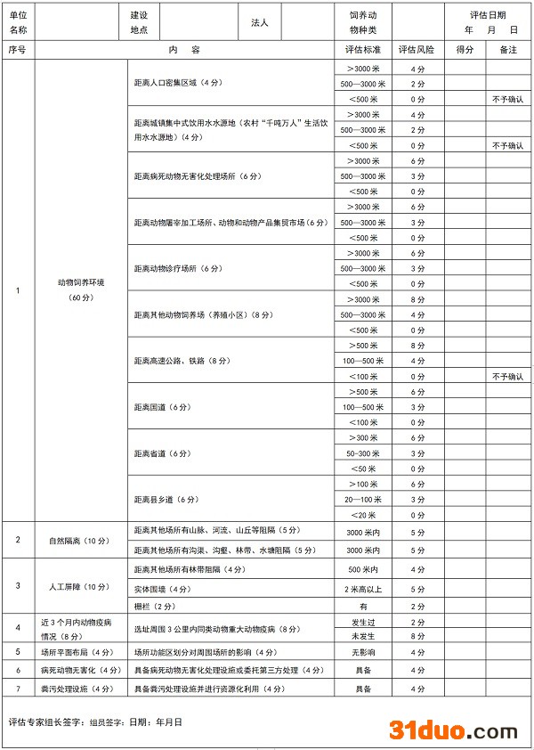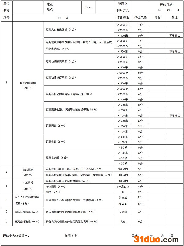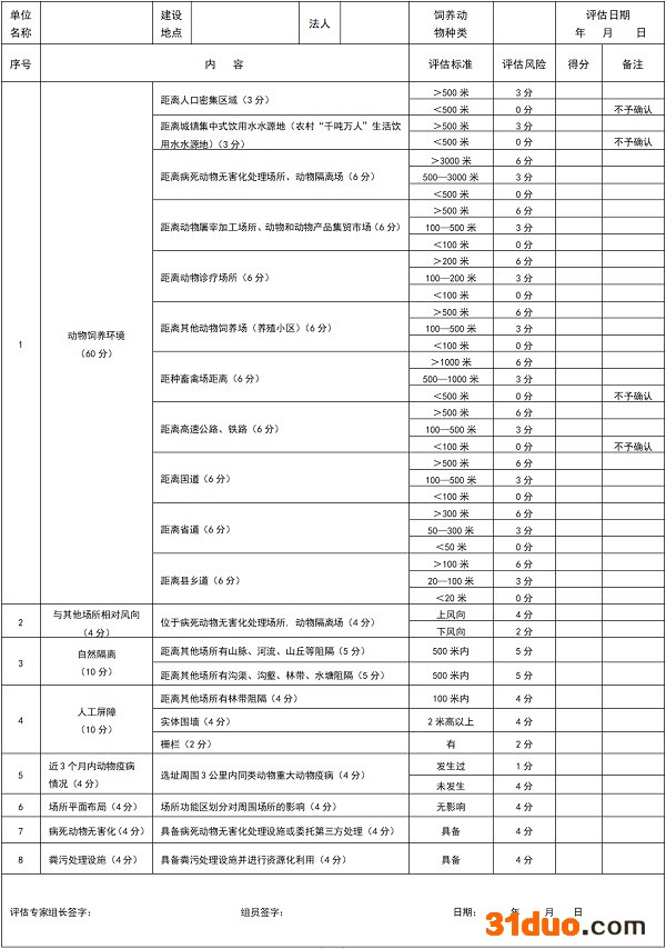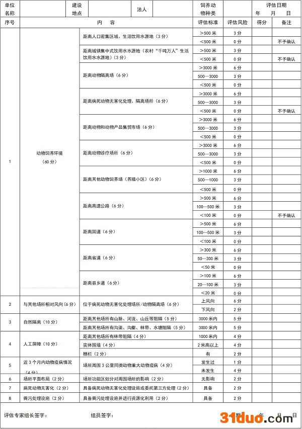 动物饲养场(养殖小区)确认选址动物防疫风险评估表