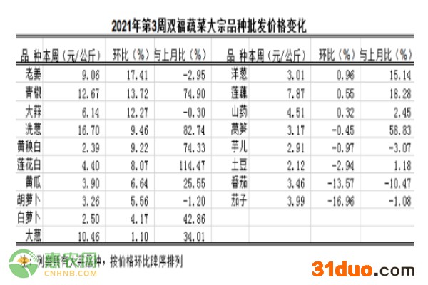 第3周蔬菜批发价格环比表现19涨12跌8平稳,总体算术批发均价6.69元(为公斤价,以下同),环比上浮0.86%,表现平稳;与12月算术均价比涨26.02%,表现大幅上涨。总体加权批发均价5.17元,环比涨2.68%,表现略涨;与12月加权均价比涨26.00%,表现大幅上涨。具体表现,环比上涨品种及价格变化:花菜6.51元,小瓜4.30元,环比分别升36.94%、32.31%,均表现陡升;冬瓜7.20元,环比涨26.95%,表现大幅上涨;菜心、老姜、老南瓜、青椒、大蒜环比分别涨18.99%、17.41%、15.46%、13.72%、12.27%,均表现明显上涨。环比下跌品种及价格变化:茄子、小白菜、小米椒、番茄环比分别跌16.96%、16.91%、13.76%、13.57%,均表现明显下跌。其余品种涨跌幅度均小于10.00%。(部分品种见下表)