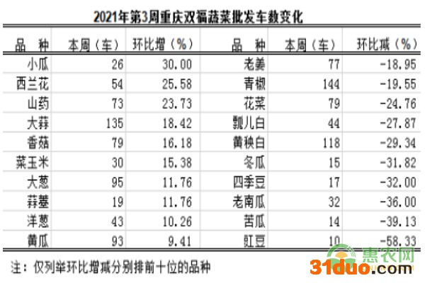 过对我市最大的蔬菜批发市场--双福国际农贸城第3周(01月18日-01月24日)39个品种蔬菜批发交易情况监测,环比表现:总批发量、大宗品种批发量均减少;总体算术批发价平稳、大宗品种算术批发价小幅上涨;与2020年12月比:总体算术批发价大幅上涨、大宗品种算术批发价陡升。总交易车数环比减少。