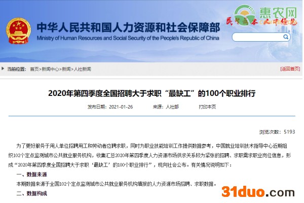 为了更好服务于用人单位招聘用工和劳动者应聘求职,同时为职业技能培训工作提供数据参考,中国就业培训技术指导中心近期组织102个定点监测城市公共就业服务机构,收集汇总2020年第四季度人力资源市场供求关系较为紧张的招聘、求职需求职业岗位信息,形成“2020年第四季度全国招聘大于求职‘最缺工’的100个职业排行”,现向社会公布。有关情况说明如下: