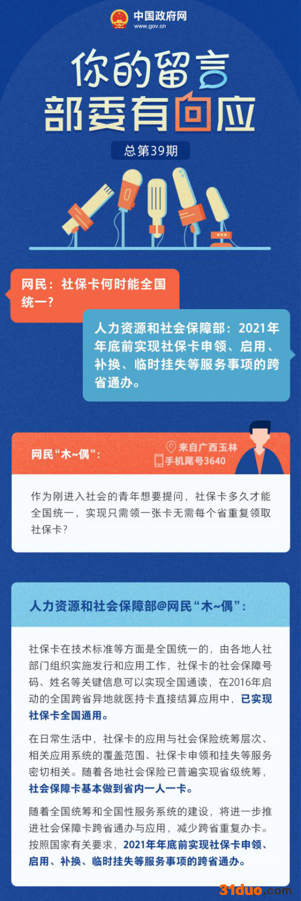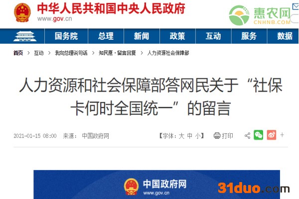 来自广西的网民“木~偶”(手机尾号3640)说:总理您好!作为刚进入社会的青年想要向您提问,社保卡多久才能全国统一,实现只需领一张卡无需每个省重复领取社保卡?养老保险转移只能转移个人所缴纳金额,公司缴纳金额无法转移,请问公司缴纳有何用处?希望尽快实行社保统一。