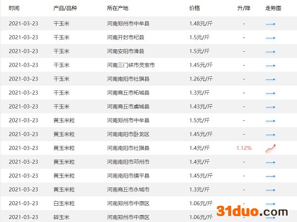 河南郑州市中牟县干玉米1.48元/斤;河南三门峡市灵宝市干玉米1.4元/斤;河南郑州市中牟县黄玉米粒1.5元/斤;河南南阳市社旗县黄玉米粒1.38元/斤;河南南阳市社旗县碎玉米1元/斤;河南商丘市柘城县碎玉米0.8元/斤;河南南阳市卧龙区杂交玉米粒1.45元/斤;河南南阳市社旗县玉米干粮1.47元/斤;河南南阳市镇平县玉米干粮1.46元/斤等。