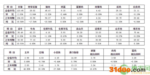 据对全省50个畜产品及饲料集市价格监测点数据分析,本周全省仔猪、玉米价格上涨,活猪、猪肉、鸡蛋、活鸡、牛肉、羊肉、生鲜牛乳价格下降,其他畜产品和饲料价格振荡运行。