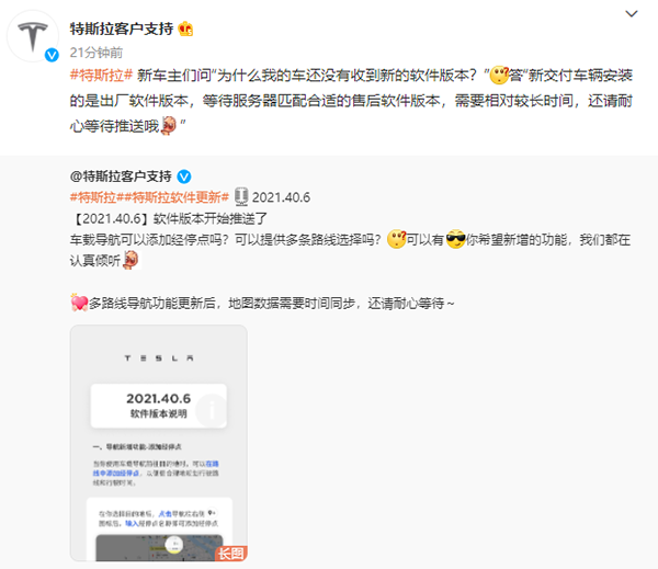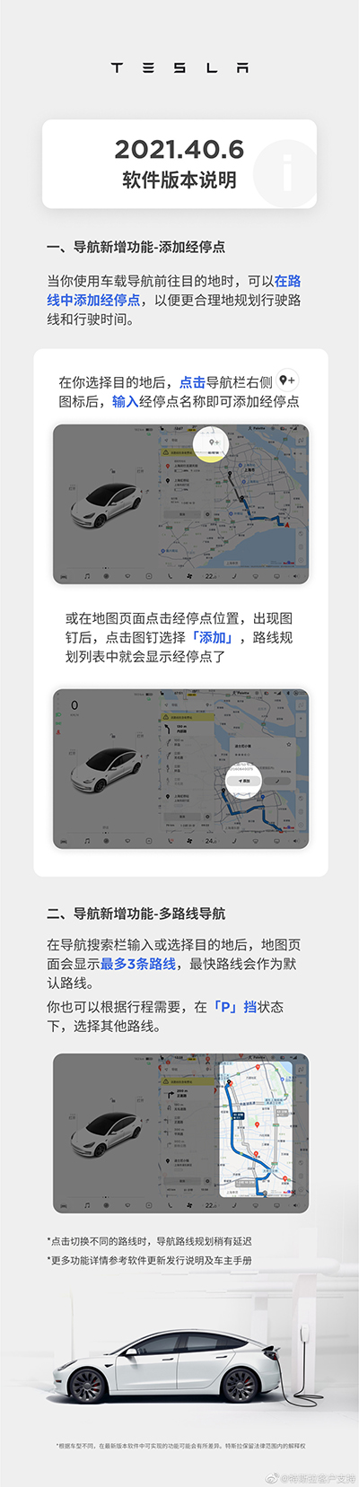 据特斯拉客户支持微博,特斯拉官方在 11 月 26 日称,特斯拉软件版本 2021.40.6 开始推送,车载导航可添加经停点,提供多条路线