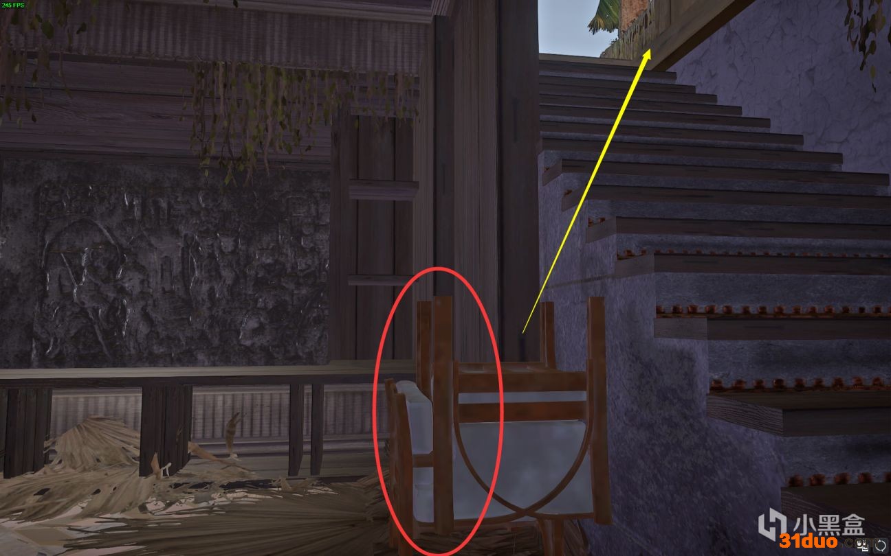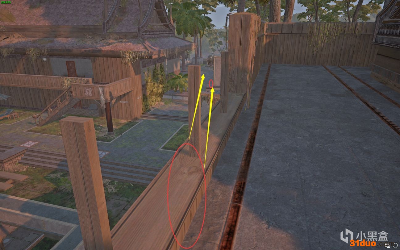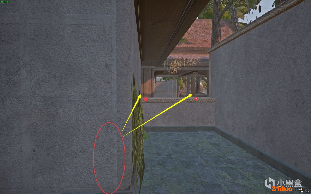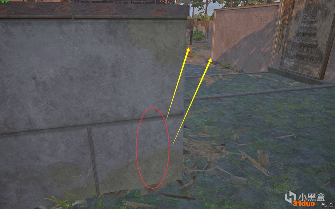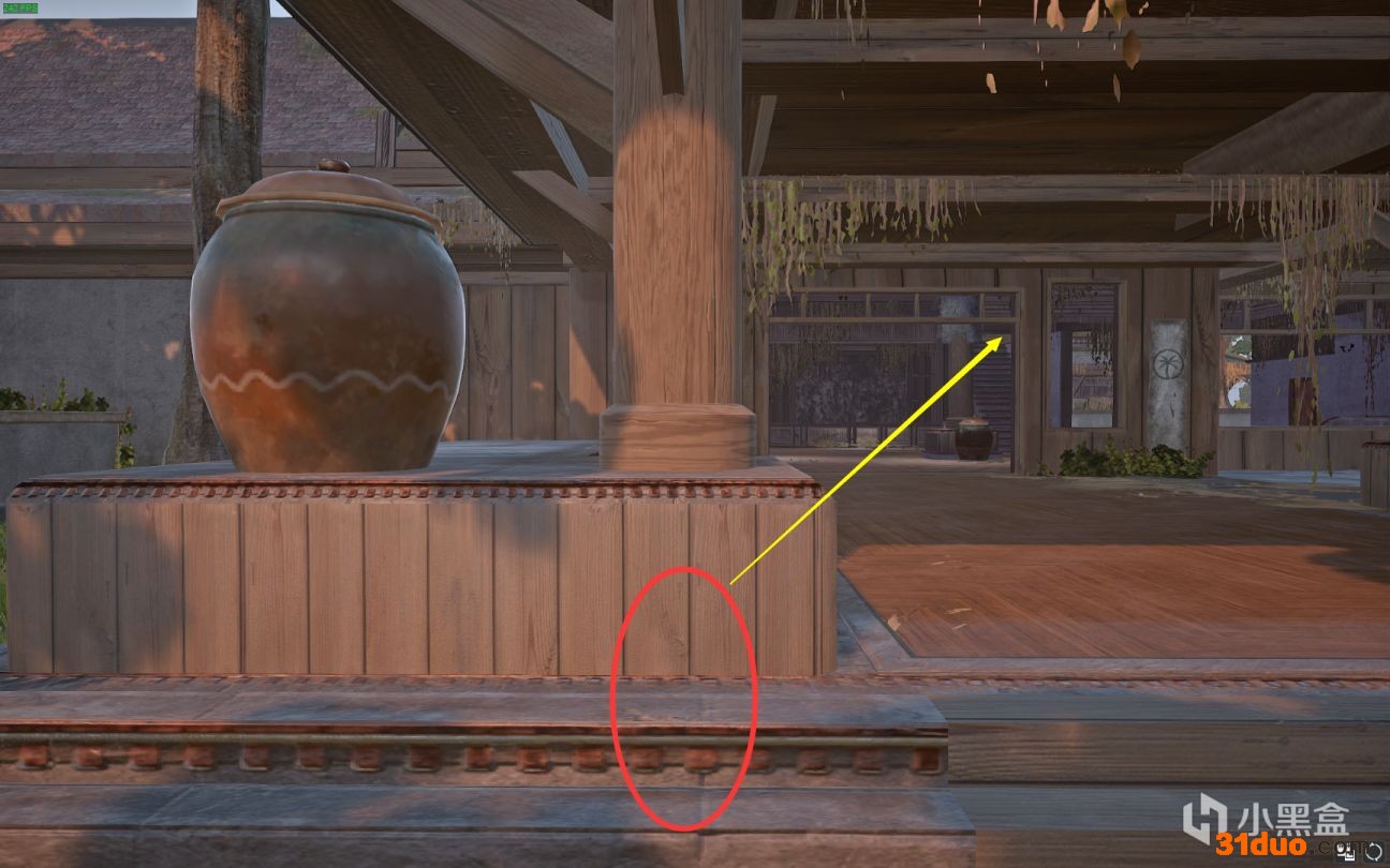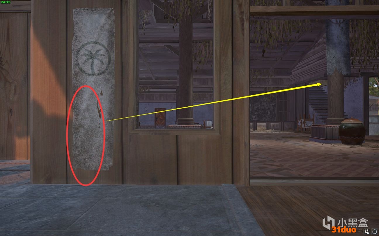 一般跳二楼的敌人捡到枪后,会下意识的去楼梯右手边的木板后进行一个架点,我们就用以上方法进行对敌人击杀。(建议捡到武器后立刻去架点,不要给敌人操作空间)在这个位置一定要注意旁边小房子有没有跳人