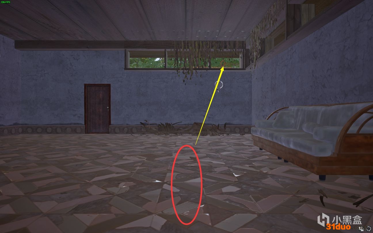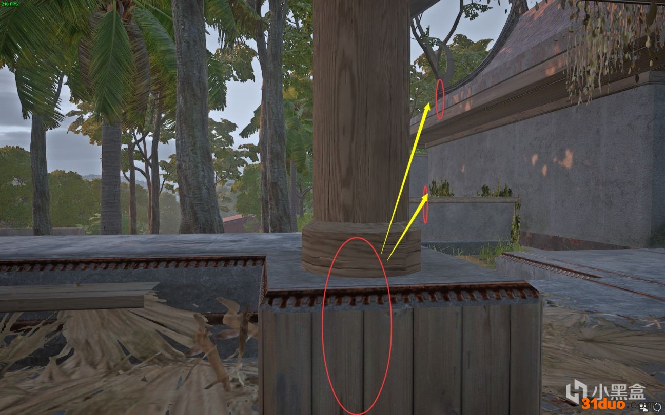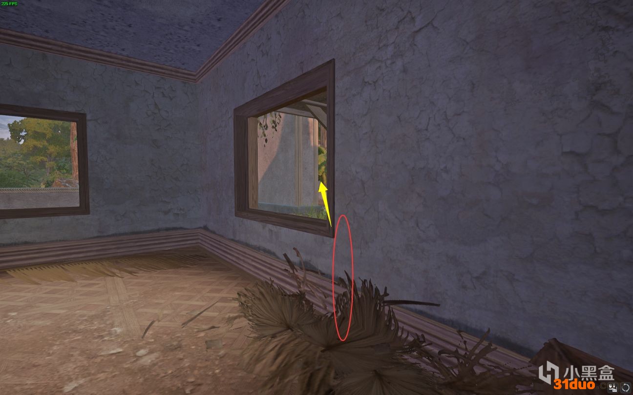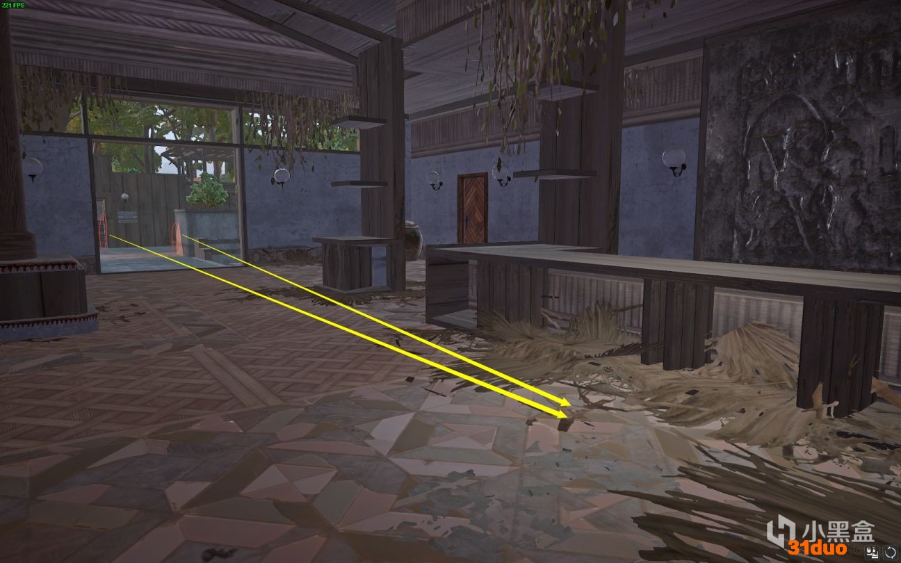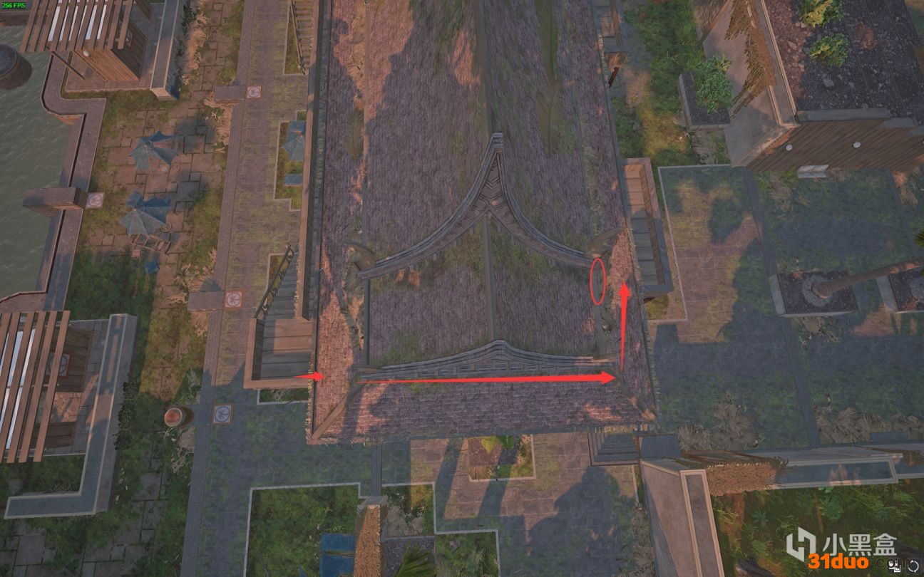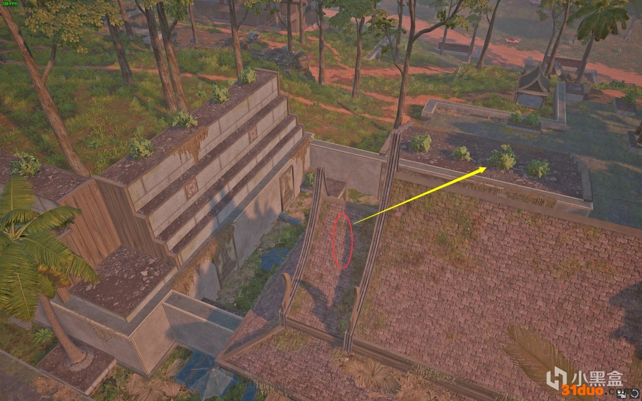 一般跳二楼的敌人捡到枪后,会下意识的去楼梯右手边的木板后进行一个架点,我们就用以上方法进行对敌人击杀。(建议捡到武器后立刻去架点,不要给敌人操作空间)在这个位置一定要注意旁边小房子有没有跳人