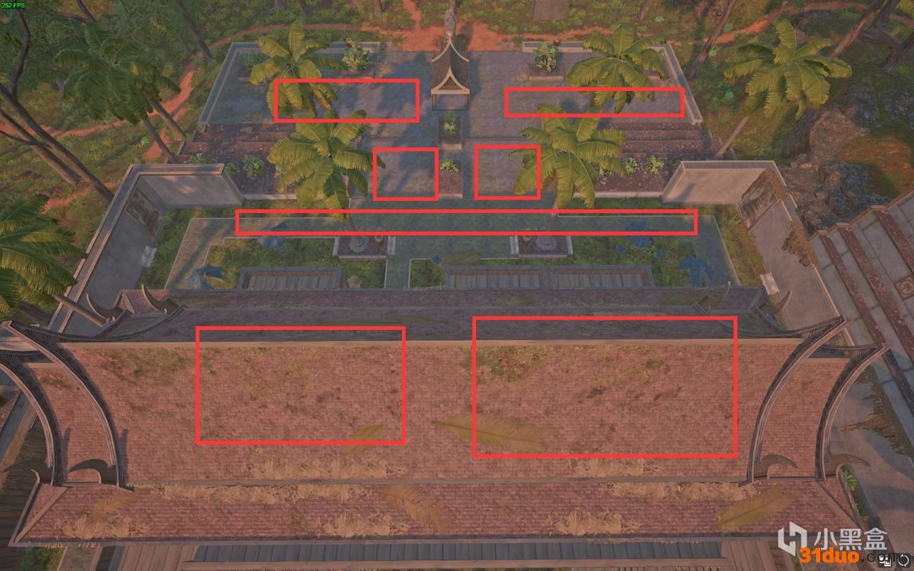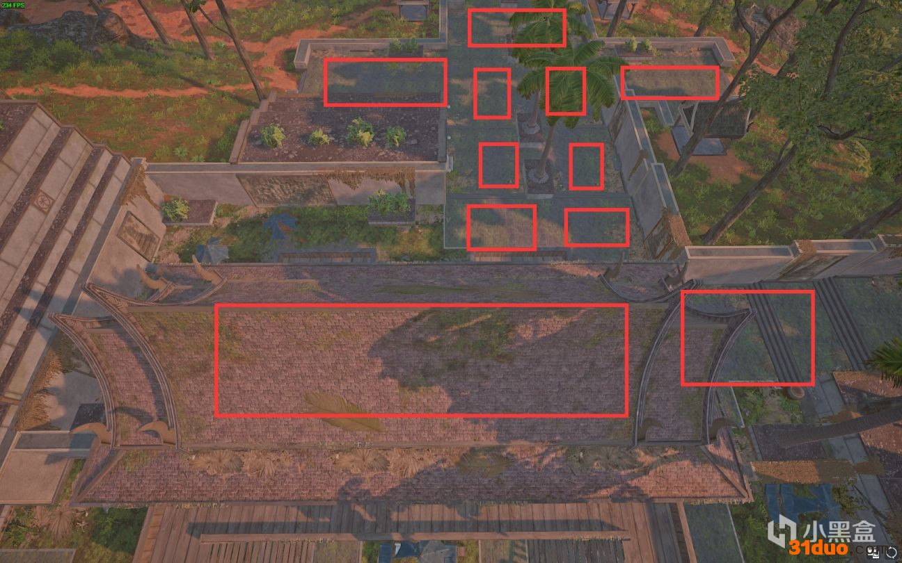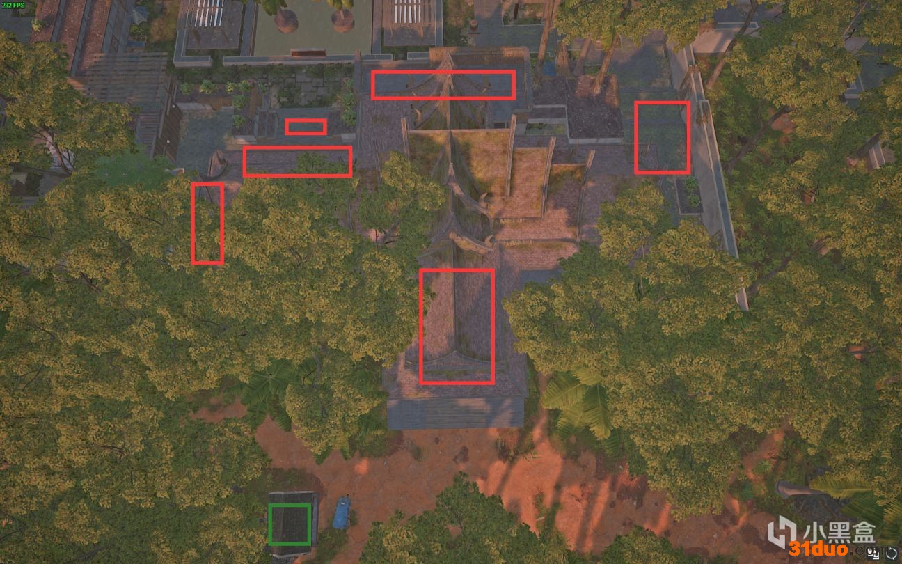 双房作为几个热门跳点之一,人还是不少的。落地红色框均为刷枪区域,落地先清理人。