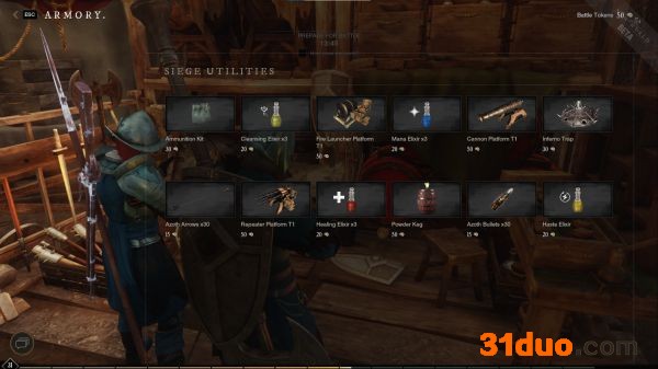 营地商人有卖各式物资(大炮/投石器/火神炮/地雷之类战场限定,出去就没了)