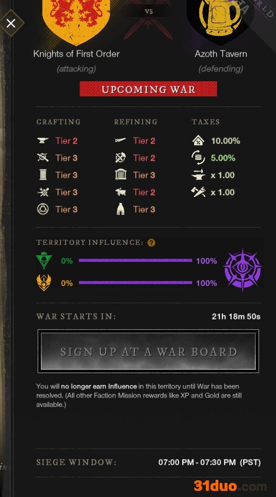 各公会可以自己设定宣战时间,买城之后会有一天的保护时间-其它阵营要想攻打我们一定要把阵营任务的能量条集满才可以打,而公会结算会在7天结算一次可得到分红。