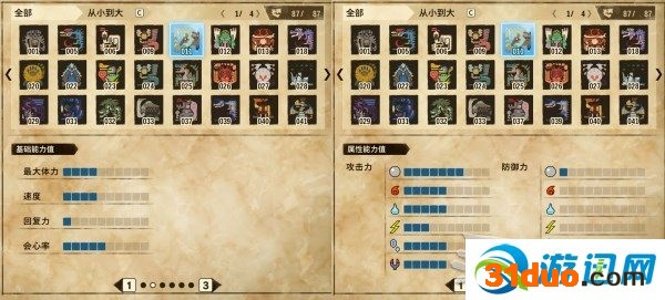 游戏内的怪物状态界面可以看到的是:最大体力、速度、攻击力、防御力、弱点、回复力、会心率中的5个,但这里的数据实际上显示的是:最大体力、速度、攻击力(无、火、水、雷、冰、龙)、防御力(无、火、水、雷、冰、龙)、回复力、会心率。