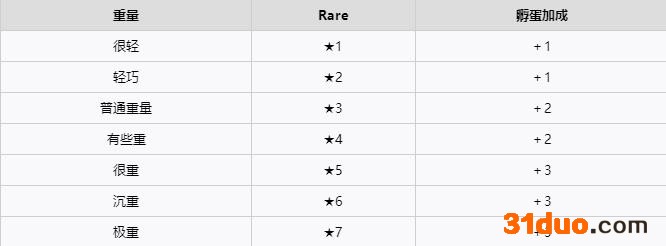 重量有7种描述(在兽棚和巢穴中的描述部分有区别),与蛋的稀有度没有太大关系,但越重的蛋就越容易刷出好的孵蛋加成(但孵蛋加成可以通过SL刷,影响不大)。