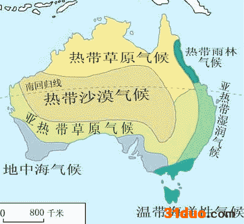 1.澳大利亚位于南半球,南回归线横穿澳大利亚中部,澳大利亚主要位于五带中的热带和南温带。最大的河流是墨累—达令河。