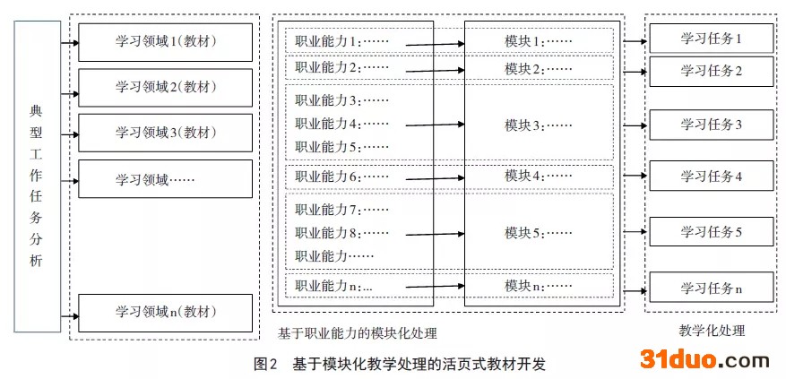 比较科学的处理方法是采用模块化的教材编写思路,在经过典型工作任务分析之后确定全部的学习领域,也就是要编写的教材基本明确,然后梳理每一个学习领域的职业能力清单,即完成这个典型的工作任务所需要的职业能力是什么,并要清晰地描述出来,并以职业能力清单引领活页式教材的开发工作。职业能力清单是教材实现模块化、活页式的重要理论支撑。然后对职业能力进行模块化教学处理,一般情况下一项职业能力对应一个模块,由于职业的特殊性,通常可能会几项职业能力对应一个模块。活页式教材设计的最终目标就是针对每一个模块设计经教学化处理的学习任务,每个模块设计一个学习任务,这样学生在学完一个学习任务后就掌握了这个学习任务所对应的一项或几项职业能力。学生完成了所有的学习任务也就掌握了一个典型的工作任务。