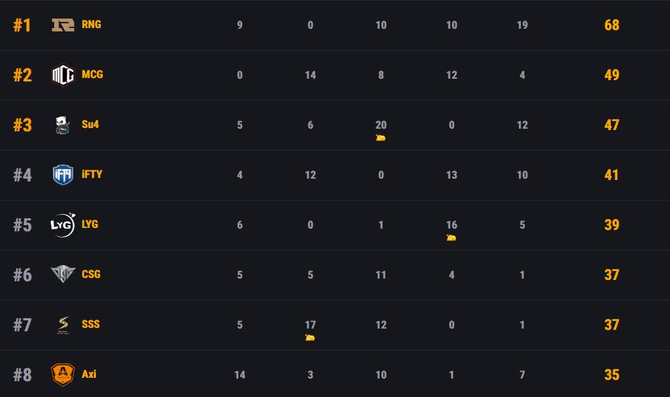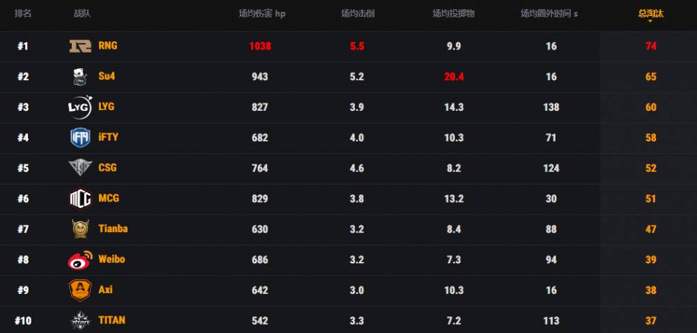 战队榜方面,RNG今天表现出色,目前以74个淘汰高居榜首。