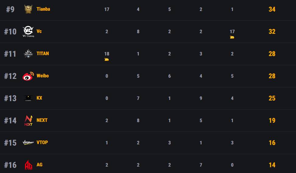 Tianba在今天的比赛中拿到34分排名第九,VC吃到一鸡积32分排名第十。