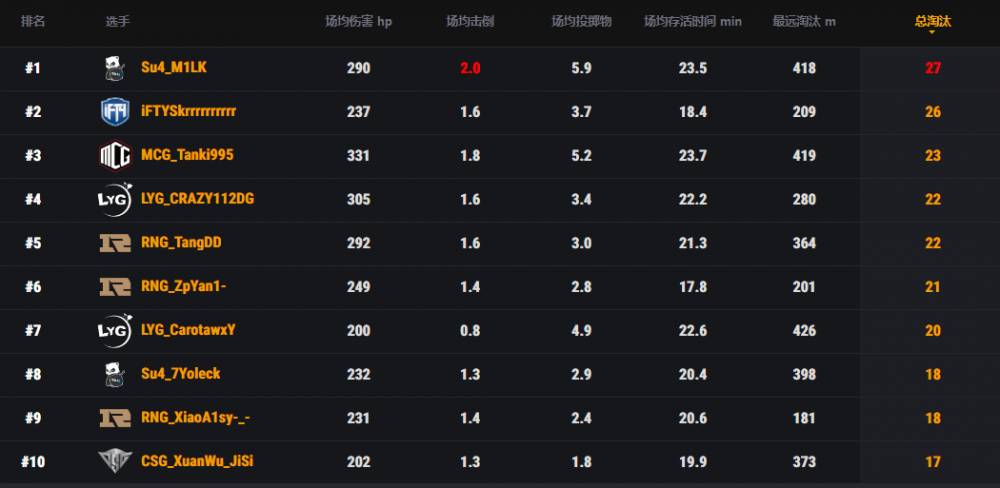 选手榜方面,M1LK拿到27个淘汰超越LongSkr来到榜首,Longskr拿到26个淘汰排名第二。
