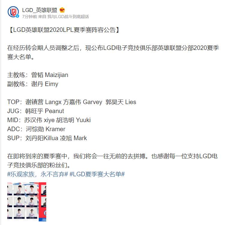 5月27日讯 今日LGD官博公布了队伍在夏季赛的大名单,多位新援加入。