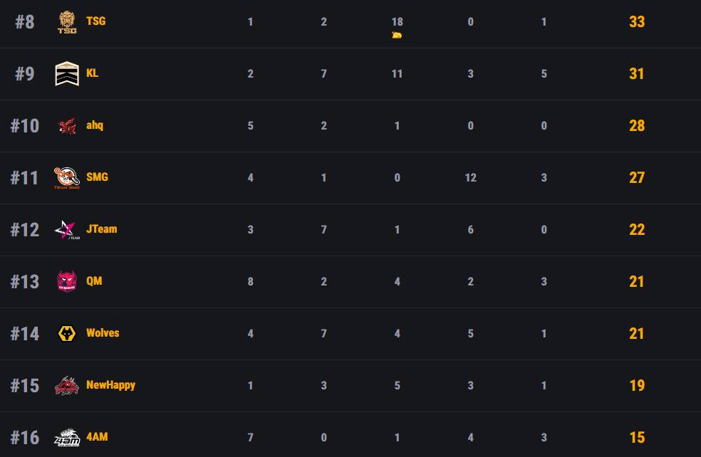 SMG表现一般拿到27分排名第十一,4AM今天表现不佳仅拿到15分垫底。