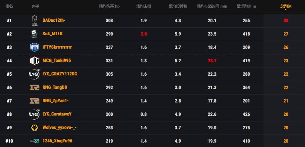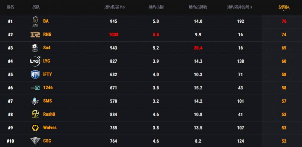 战队榜方面,BA通过今天的出色发挥反超RNG,以76个淘汰排名第一。