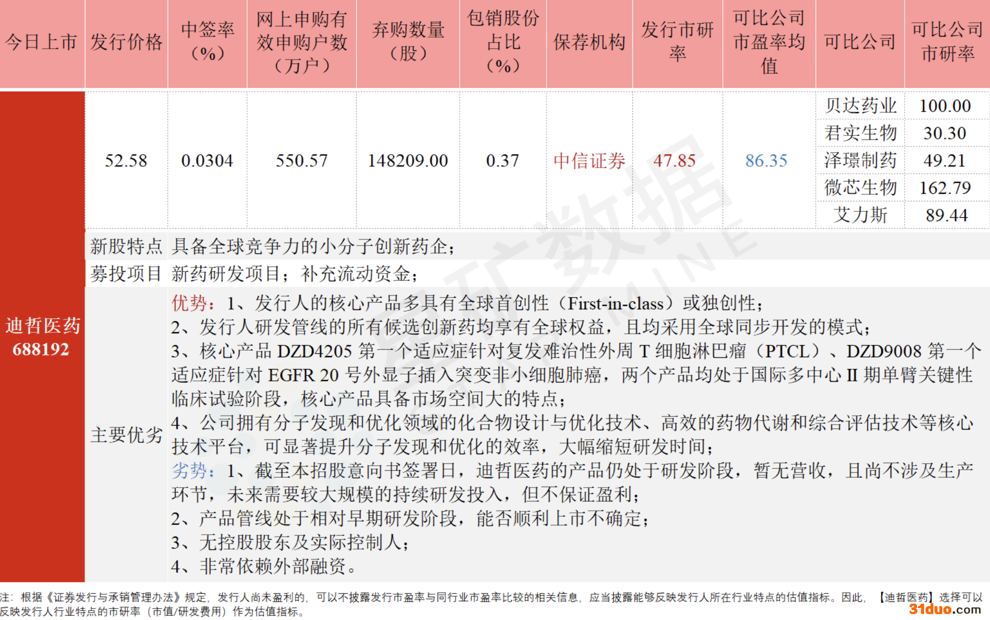 但需特别注意的,是其招股书中的如下表述:迪哲医药的产品仍处于研发阶段,暂无营收,且尚不涉及生产环节,未来需要较大规模的持续研发投入,但不保证盈利。(详见【数读IPO】背靠南方电网,市盈率79倍企业今日申购,另有“暂无营收”医药股上市https://www.cls.cn/detail/892194)