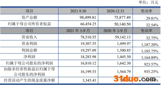 2021年1-9月,东芯股份实现营业收入7.85亿元,同比增长32.75%;实现归属于母公司股东的净利润1.68亿元,同比增长923.57%;实现归属于母公司股东的扣除非经常性损益后的净利润为1.62亿元,同比增长935.25%;经营活动产生的现金流量净额为3345.43万元,同比增长347.84%。