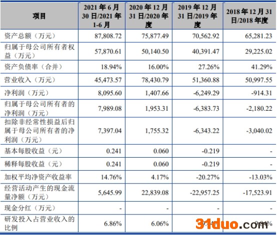 2018年、2019年、2020年、2021年1-6月,东芯股份的营业收入分别为5.10亿元、5.14亿元、7.84亿元和4.55亿元;归属于母公司所有者的净利润分别为-2180.22万元、-6383.73万元、1953.31万元、7989.08万元;扣除非经常性损益后归属于母公司股东净利润分别为-3040.02万元、-6343.22万元、1755.32万元和7397.04万元;经营活动产生的现金流量净额分别为-1.75亿元、-2.30亿元、2.28亿元、5645.99万元。