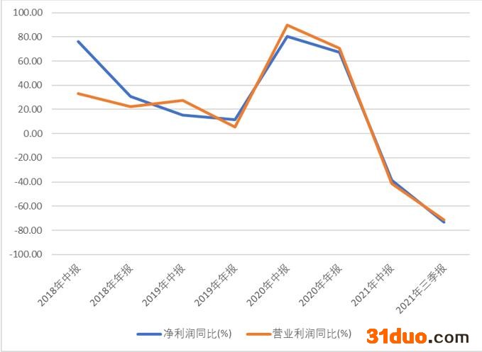 在第三个解除限售期的公司业绩考核目标完成后,万兴科技的业绩就出现的“大变脸”,2021年的业绩出现明显的回落。数据显示,2018年至2021年三季度,公司营业利润同比分别为22.23%、5.59%、70.39%以及-71.31%;净利润同比分别为30.55%、11.63%、67.18%以及-73.09%。