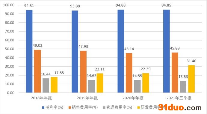 除了营业利润外,万兴科技的高毛利与高费用率也令人诟病。数据显示,2018年-2021年三季度,公司毛利率分别为94.51%、93.88%、94.88%及94.85%;期间相关费用率(销售费用率、管理费用率、研发费用率合计)分别为83.31%、84.66%、82.08%及90.88%。