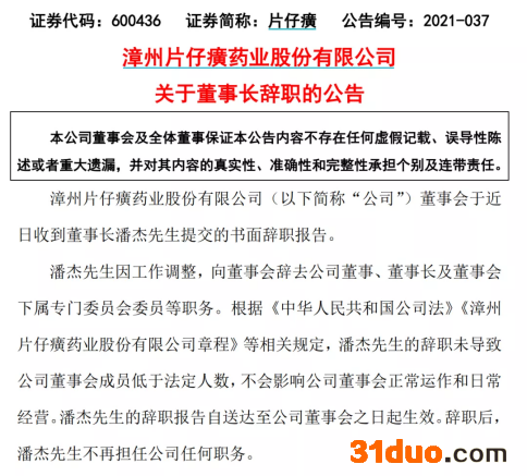 公告显示,潘杰先生因工作调整,向董事会辞去公司董事、董事长及董事会下属专门委员会委员等职务。根据《中华人民共和国公司法》《漳州片仔癀药业股份有限公司章程》等相关规定,潘杰先生的辞职未导致公司董事会成员低于法定人数,不会影响公司董事会正常运作和日常经营。潘杰先生的辞职报告自送达至公司董事会之日起生效。辞职后,潘杰先生不再担任公司任何职务。