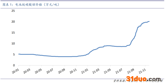 受新能源需求端拉动,锂价今年以来价格持续强势。据太平洋证券研报数据,锂价上涨贯穿2021年全年,电池级碳酸锂价格于2020Q3触底,最低跌破4万/吨,随后开始反弹上涨,从2020年Q4的5万元/吨一路上涨,今年三季度实现第一次翻番,达到10万元/吨,四季度实现年内第二次翻番,直至目前的20万元/吨。