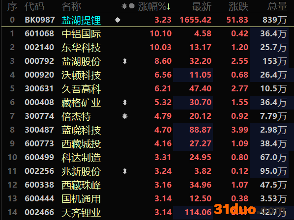 财联社(上海,编辑 梓隆)讯,今日(12月10日),盐湖提锂板块大幅拉升,截止上午11时左右,板块指数涨逾3%,个股方面,中铝国际、东华科技涨停,盐湖股份涨逾8%,沃顿科技、久吾高科、藏格矿业等股涨幅居前。