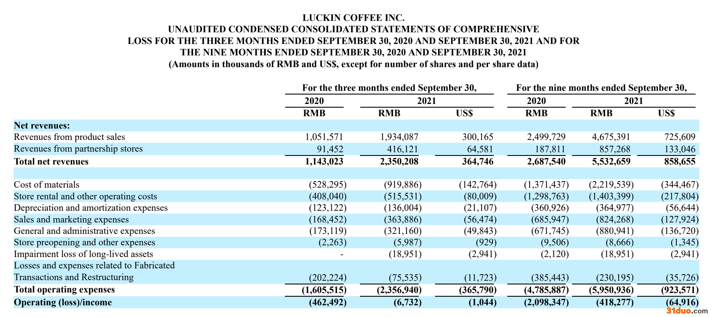 值得一提的是,2021年第三季度,瑞幸咖啡因此前财务造假事件和重组相关的亏损和费用为7550万元,同比下降了62.6%。