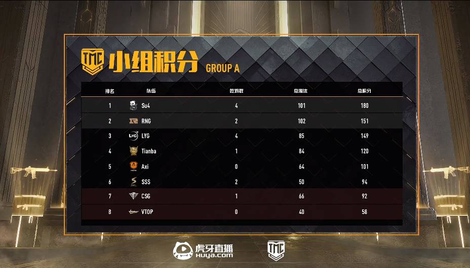 A组积分方面,Su4在小组赛期间吃到4鸡拿下180分位居A组第一,RNG则是两鸡积151分排名第二,这两支战队将会直接晋级决赛。
