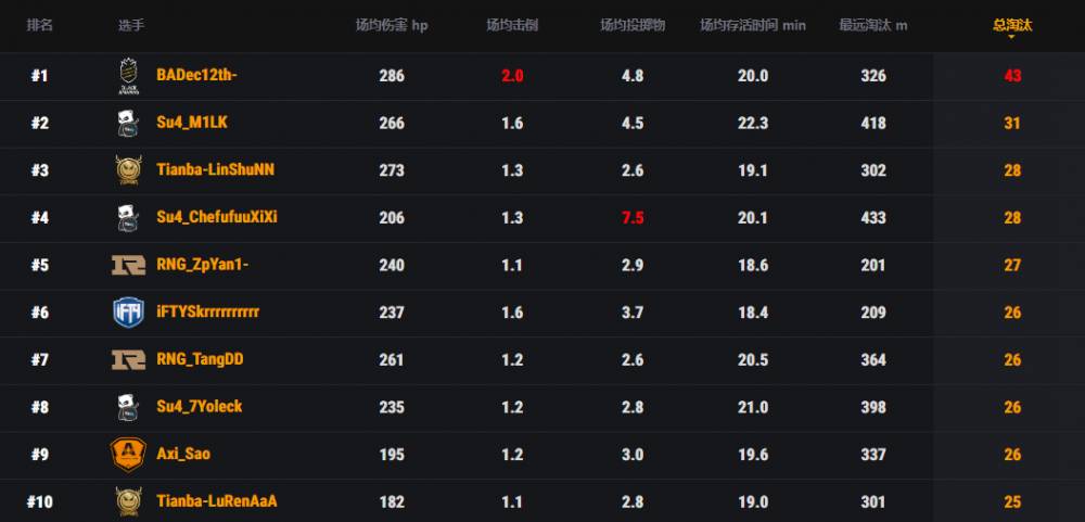 战队榜方面,RNG以102次淘汰力压Su4目前居首。