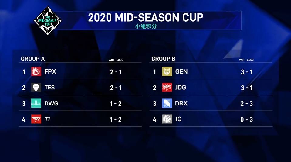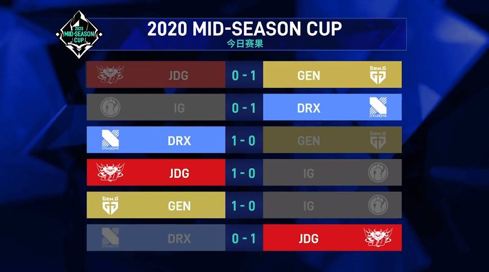 5月29日讯 在今天的LOL季中杯比赛中,JDG双杀DRX通过加赛成功晋级四强。GEN同样通过加赛的方式,击败DRX锁定头名晋级四强。而另一支LPL战队IG今日表现不佳,小组赛未能取得一胜。