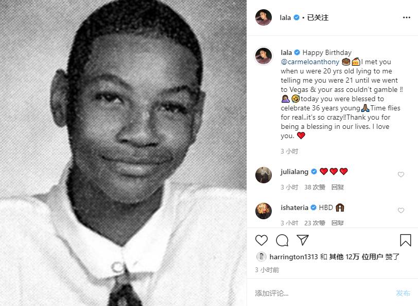 “生日快乐@carmeloanthony!记得那年认识你是20岁而你骗我21岁,当时我们去拉斯维加斯约会,结果你个傻瓜上不了赌桌(赌城规定21岁以下不准赌博)……现在的你已经36岁了!时间过得真快……简直让人不敢相信!谢谢你保护着我们一家!我爱你。”拉拉写道。