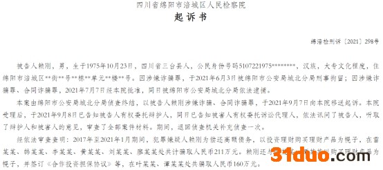 中国经济网北京12月10日讯 中国检察网日前披露了《四川省绵阳市涪城区人民检察院起诉书》(绵涪检刑诉〔2021〕298号)。时任华西证券什邡蓥华山营业部负责人赖刚涉嫌诈骗罪、合同诈骗罪,共骗取人民币合计371万元。