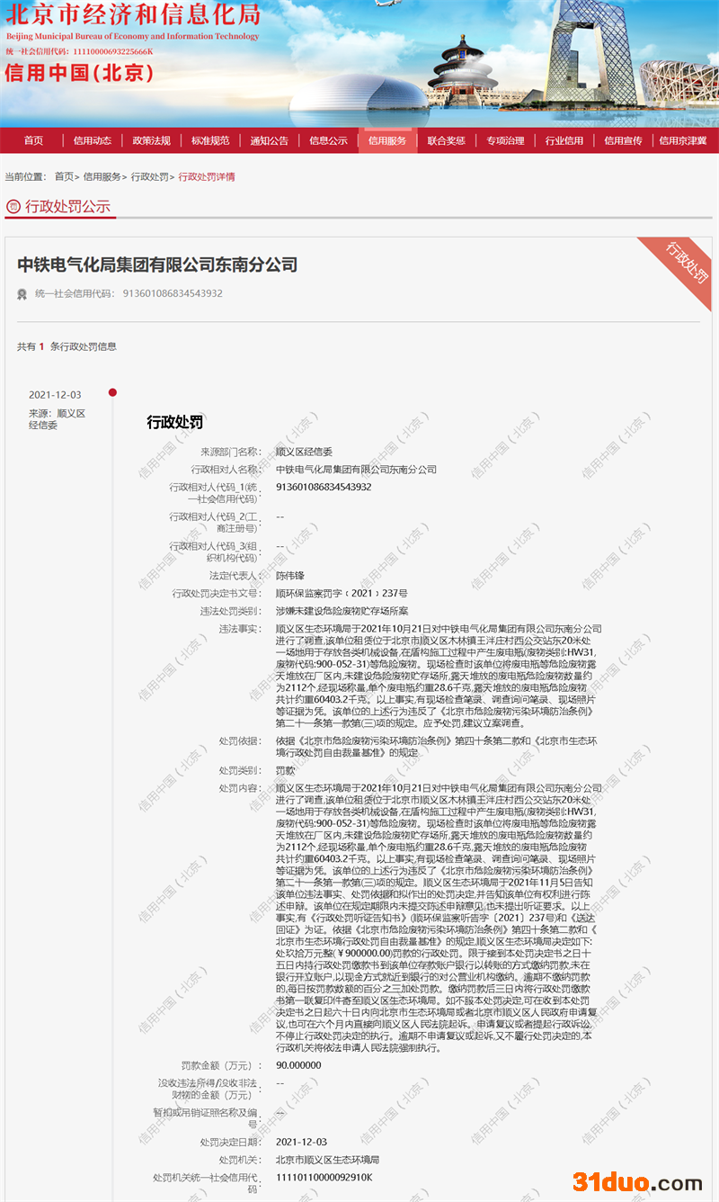 中国网财经12月10日讯(记者 钟文鑫)据信用中国北京网站12月9日公示的一则行政处罚信息,近日,中铁电气化局集团有限公司东南分公司因将废电瓶等危险废物露天堆放,未建设危险废物贮存场所,违反了《北京市危险废物污染环境防治条例》相关规定,被北京市顺义区生态环境局罚款90万元。