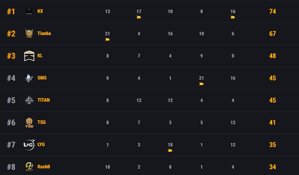 5月31日讯 今天天命杯结束了淘汰赛的比赛,最终KX吃到两鸡拿下74排名第一晋级决赛,Tianba与KL分别拿下67分与48分排名二三位。