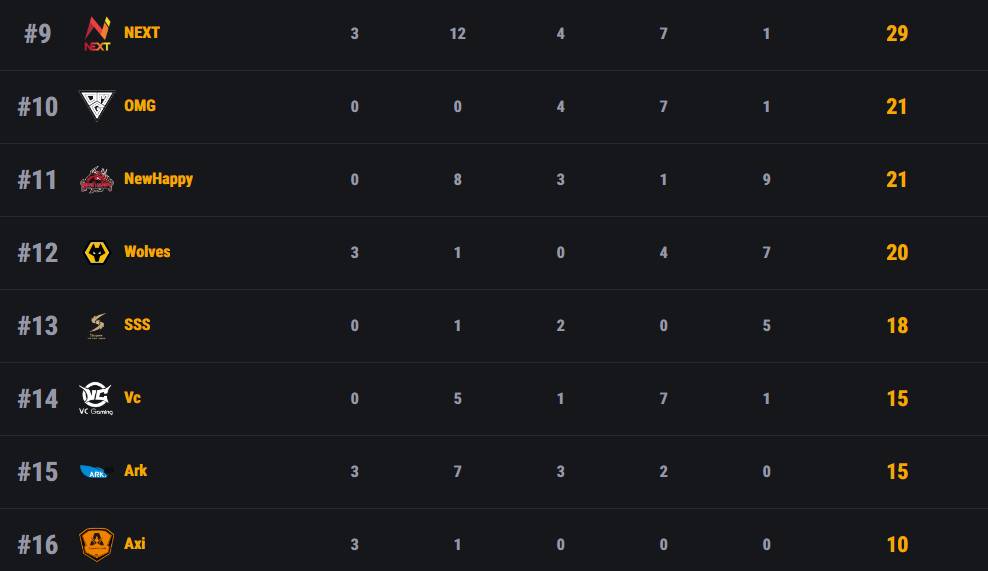 根据本次比赛规则,淘汰赛前八的战队将会晋级决赛。OMG在今天的比赛中表现不佳,仅拿到21分排名第十,无缘天命杯决赛。