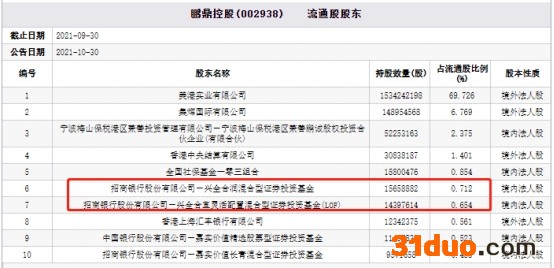 招商银行股份有限公司-兴全合润混合型证券投资基金持有鹏鼎控股1565.89万股,占流通股比例为0.712%,是其第六大流通股东;招商银行股份有限公司-兴全合宜灵活配置混合型证券投资基金(LOF)持有鹏鼎控股1439.76万股,占流通股比例为0.654%,是其第七大流通股东。