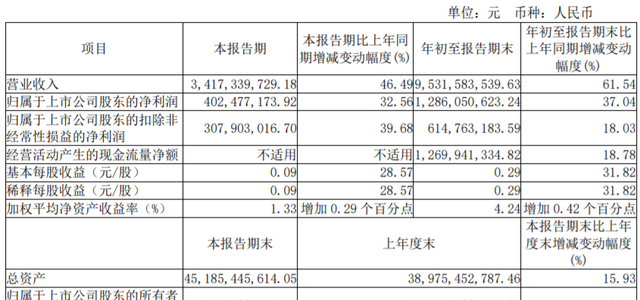 其中,第三季度,三安光电实现营业收入34.17亿元,同比增长46.49%;归属于上市公司股东的净利润4.02亿元,同比增长32.56%;归属于上市公司股东的扣非净利润3.08亿元,同比增长39.68%;基本每股收益0.09元,同比增长28.57%;加权平均净资产收益率1.33%,同比增加0.29个百分点。
