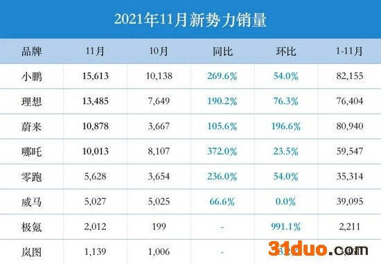 从全年的排行榜上可以轻易地看出,目前造车新势力前三甲并没有真正拉开差距,小鹏前11个月的销量仅仅比蔚来多1215辆,比理想多5751辆,而360加持后的哪吒汽车单月销量也开始突破一万,正在迅速赶超。