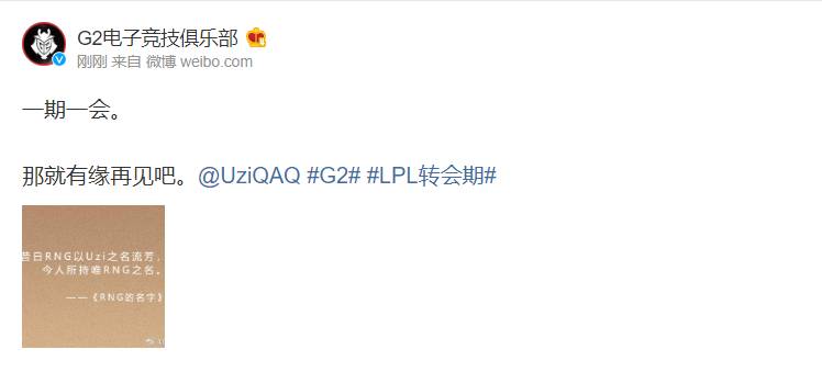 6月1日讯 今天RNG官方公布了战队夏季赛名单,其中未见Uzi,G2官博至此致敬Uzi选手。