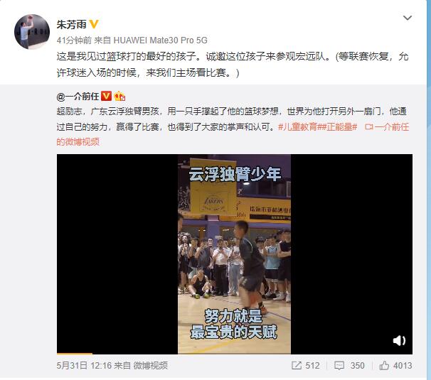 6月1日讯 今天,广东宏远男篮总经理朱芳雨更新动态,在微博上转发了云浮独臂少年张家城打球的视频报道,并称要邀请这个孩子参观宏远队。