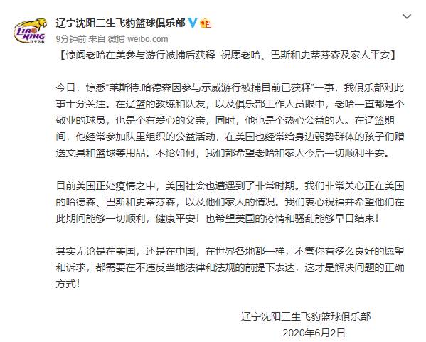 今日,惊悉“莱斯特.哈德森因参与示威游行被捕目前已获释”一事,我俱乐部对此事十分关注。在辽篮的教练和队友,以及俱乐部工作人员眼中,老哈一直都是个敬业的球员,也是个有爱心的父亲,同时,他也是个热心公益的人。在辽篮期间,他经常参加队里组织的公益活动,在美国也经常给身边弱势群体的孩子们赠送文具和篮球等用品。不论如何,我们都希望老哈和家人今后一切顺利平安。