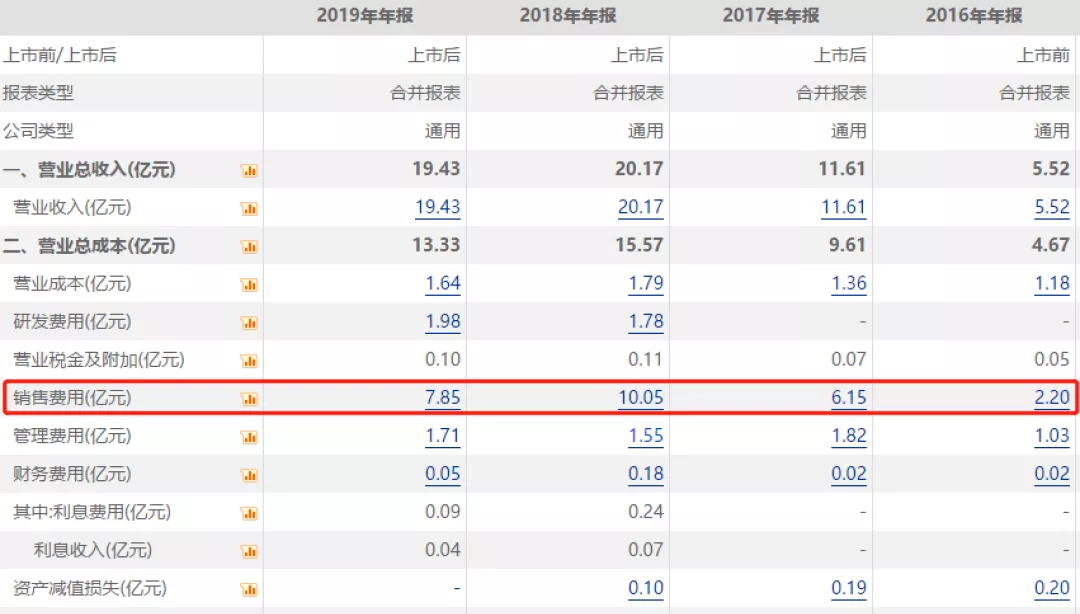 实际上,自2017年上市后,康泰生物的销售费用占比就一直“居高不下”。据年报,2016-2019年,康泰生物的营业收入分别为5.52亿元、11.61亿元、20.17亿元、19.43亿元,销售费用分别为2.2亿元、6.15亿元、10.05亿元、7.85亿元。销售费用占营业收入的比例分别为39.81%、53%、49.85%、40.37%。